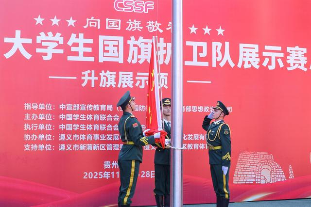 11月26日上午,由中国学生体育联合会主办,中宣部宣传教育局(全民国防教育局)、教育部思想政治工作司指导的2025年中国大学生国旗护卫队展示赛总决赛在遵义市奥体中心开幕。来自全国58所高校的78支国旗护卫队1400余人齐聚遵义,以整齐步伐、严整队列和庄重仪态,共同诠释对国旗的忠诚与对祖国的热爱。