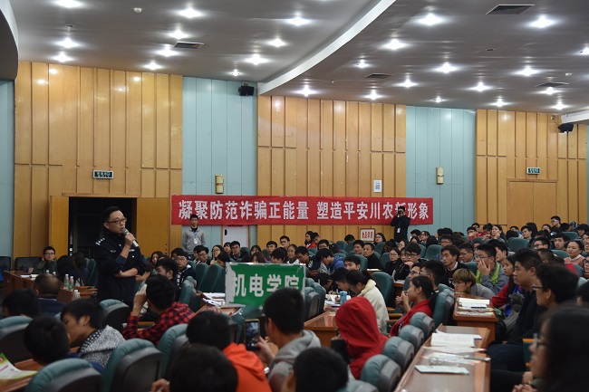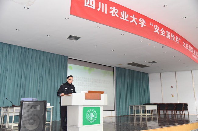 11月3日晚,由校保卫处、学生处主办,校学生治安服务队、校学生军事爱好者协会、校学生义务消防队联合承办的“校园防盗防骗安全知识讲座”在雅安校区举行。雨城分局东城派出所警官吴宇翔、李劲,水利水电学院、理学院、机电学院、法学院、保卫处相关负责人及雅安校区500余名师生代表聆听讲座。