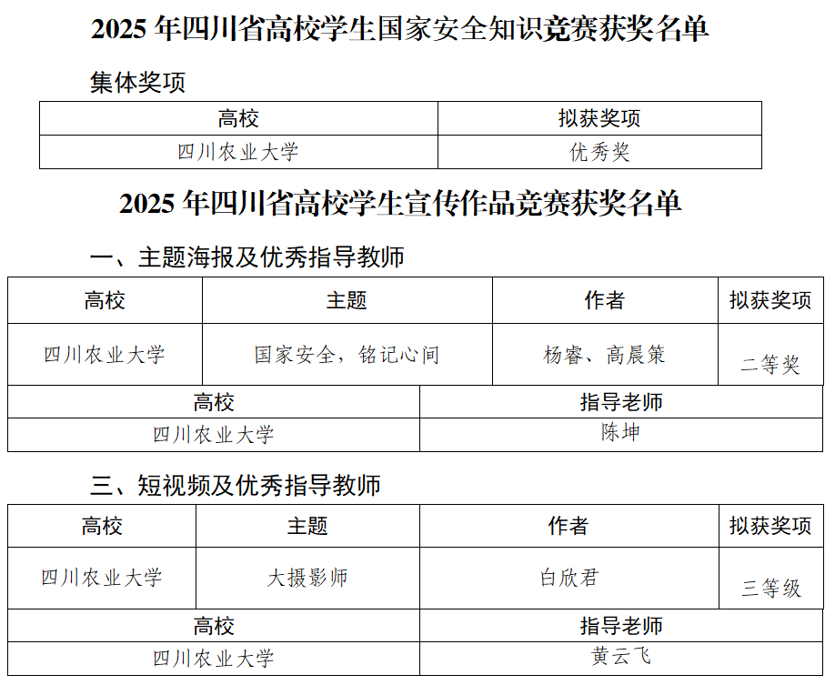 近日,由四川省教育厅、四川省国安厅、共青团四川省委联合主办的2025年四川省高校学生国家安全知识暨宣传作品竞赛顺利结束。我校在国家安全知识竞赛中获集体项目优秀奖,1个作品在宣传作品竞赛的主题海报赛道获评二等奖及优秀指导老师,1个在微电影赛道获评三等奖及优秀指导老师。