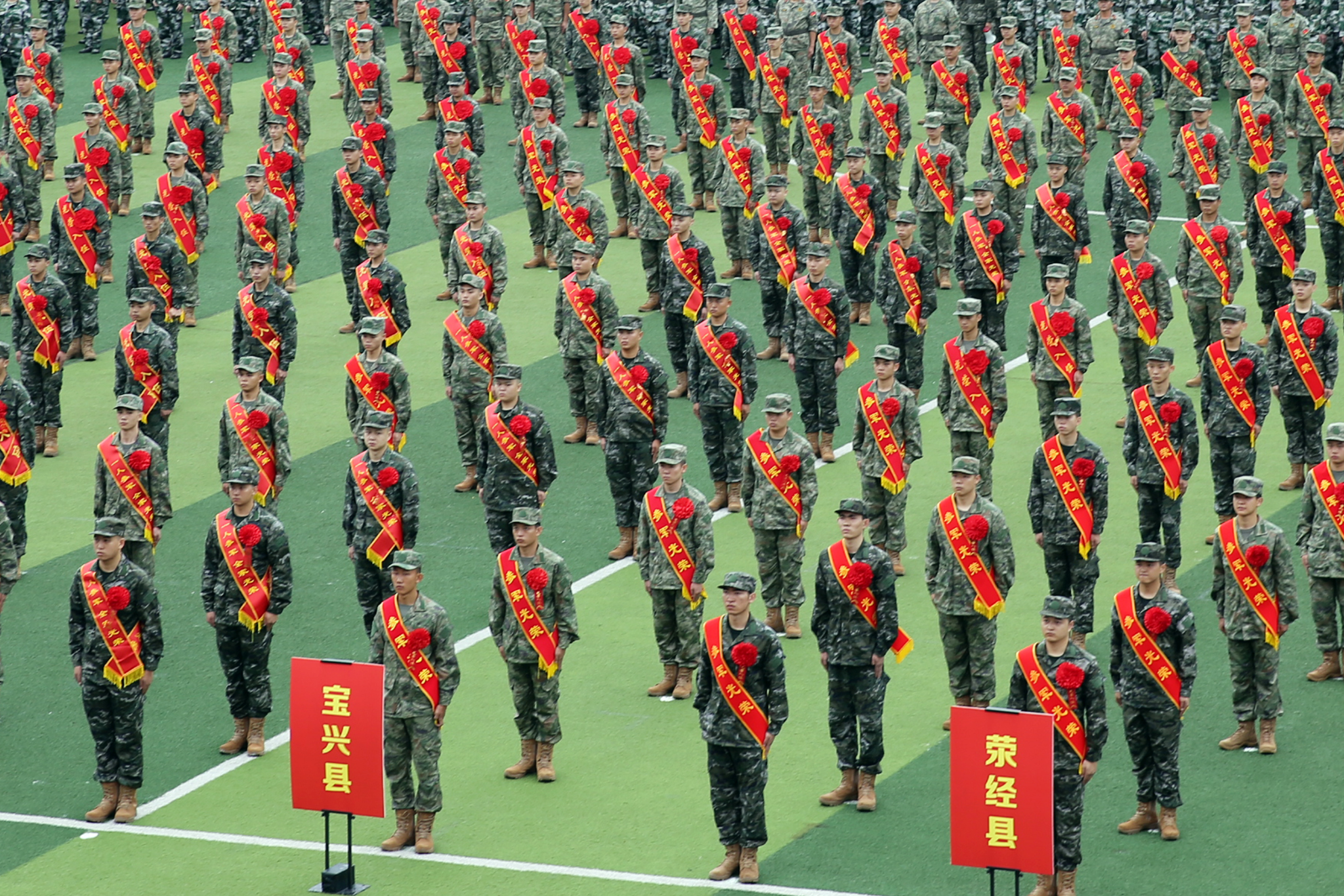 欢送仪式上,准新兵们身着军装、佩戴绶带整齐列队,精神抖擞。